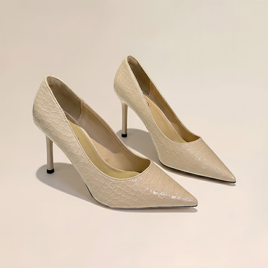 美しいポインテッドトゥと高い細ヒールが、足を長く美しく見せる効果を生み、歩くたびに洗練されたエレガンスを演出。