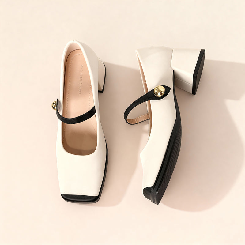 フレンチムード薫るスクエアトゥのメリージェーンを、つま先のコンビキャップでモダンに仕上げました。