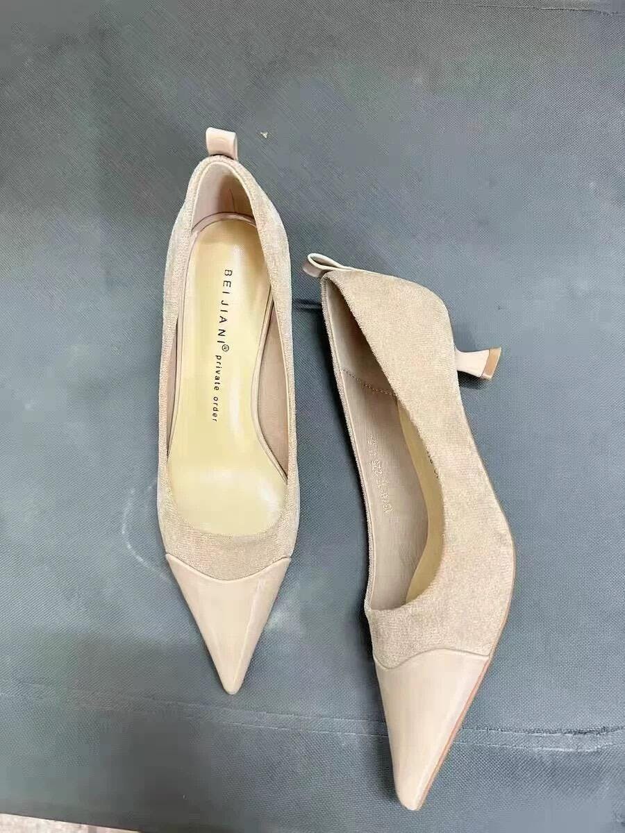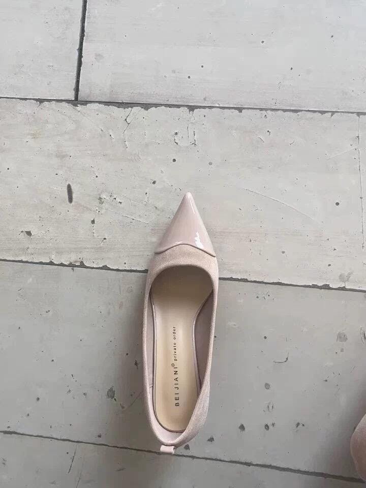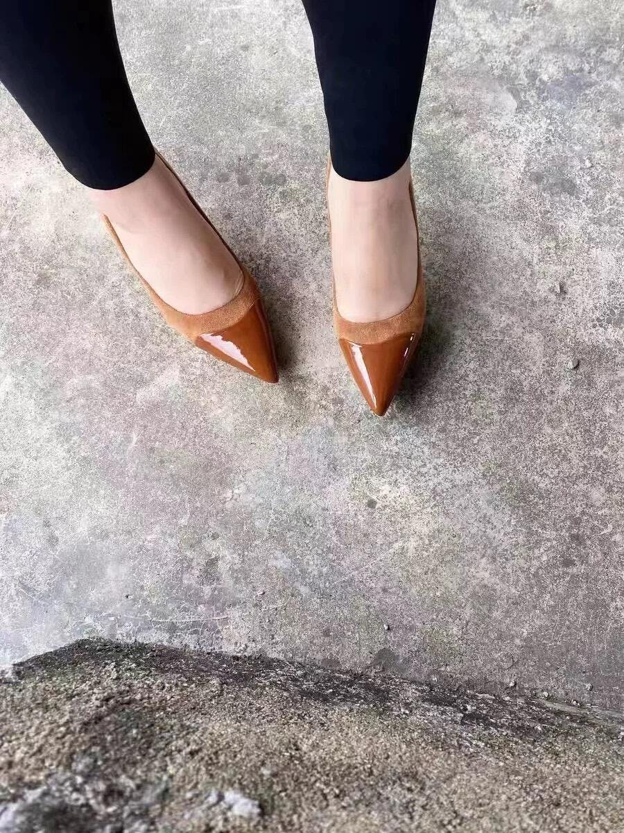 スエード素材と光沢のあるつま先デザインが特徴のパンプス。