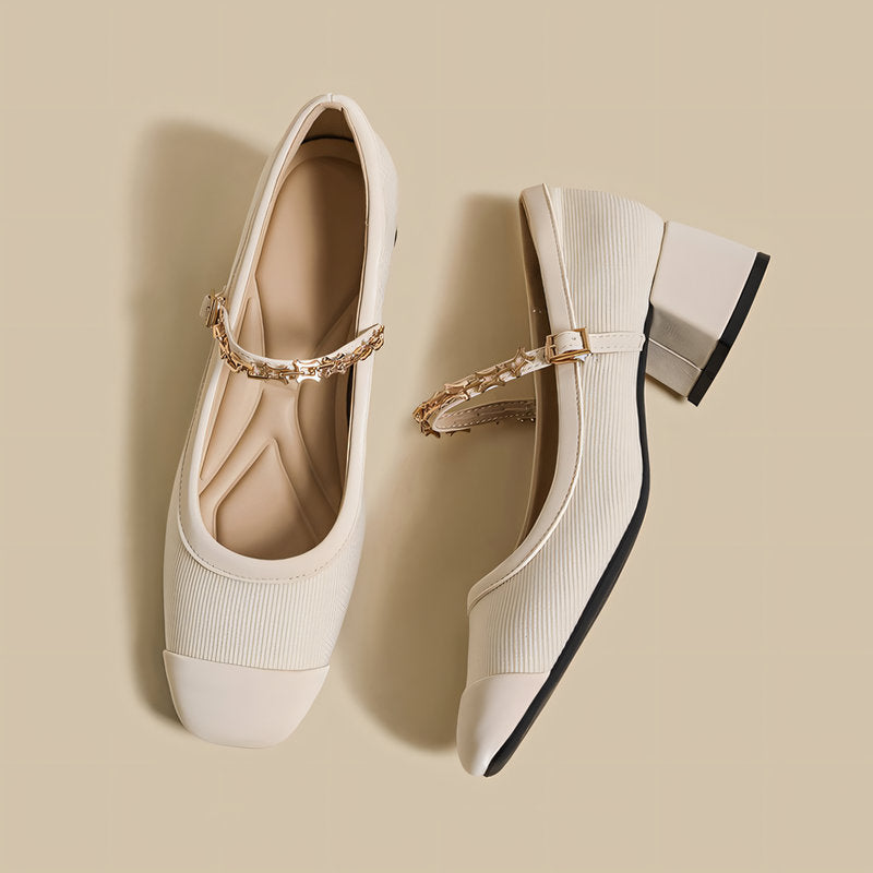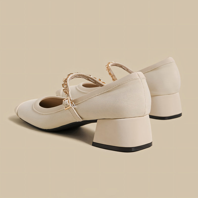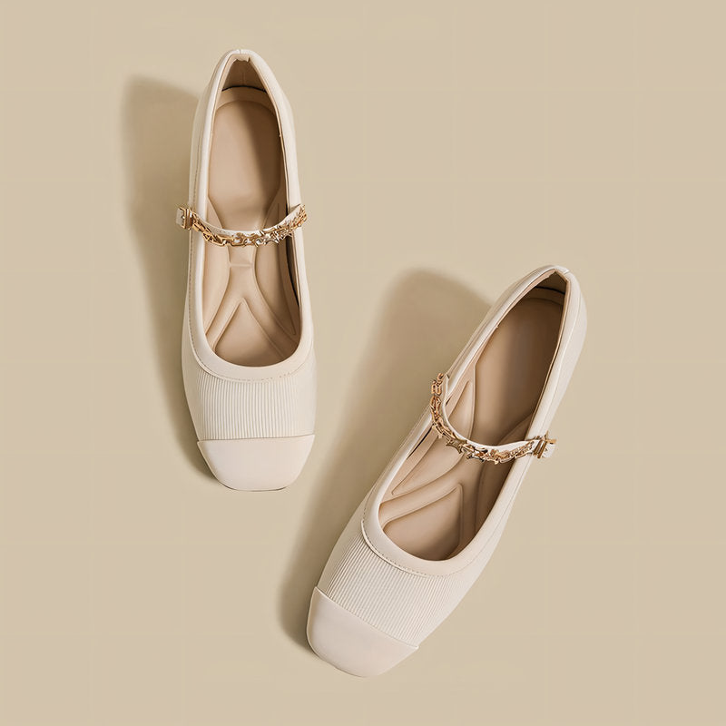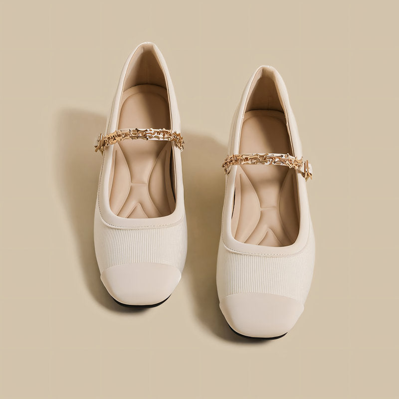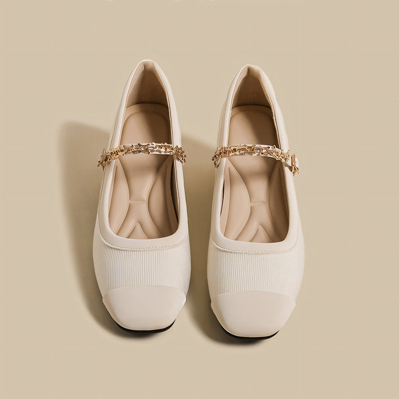 特徴的なゴールドチェーンが施されたストラップが、シンプルでありながらも華やかさを加え、足元に上品なアクセントをもたらします。