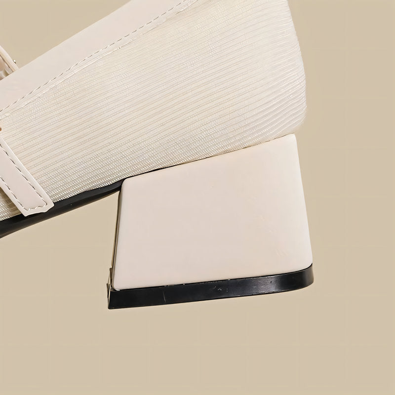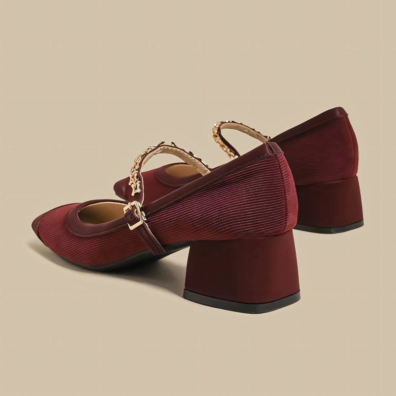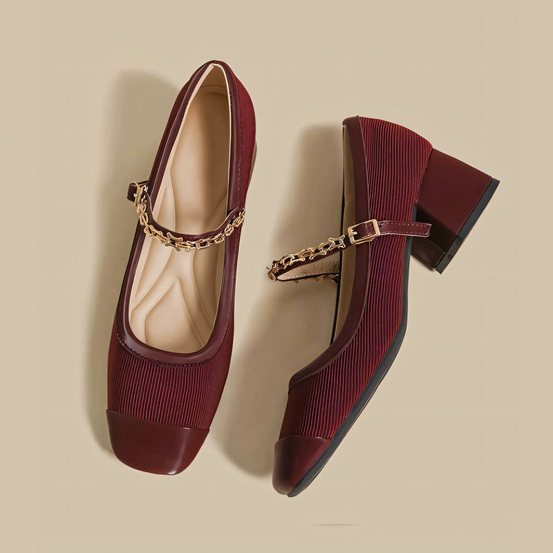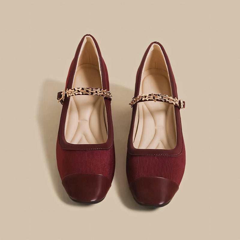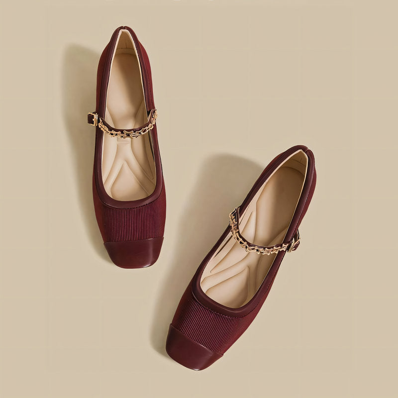 特徴的なゴールドチェーンが施されたストラップが、シンプルでありながらも華やかさを加え、足元に上品なアクセントをもたらします。