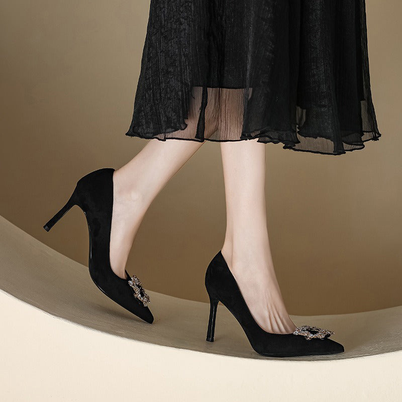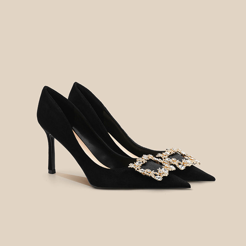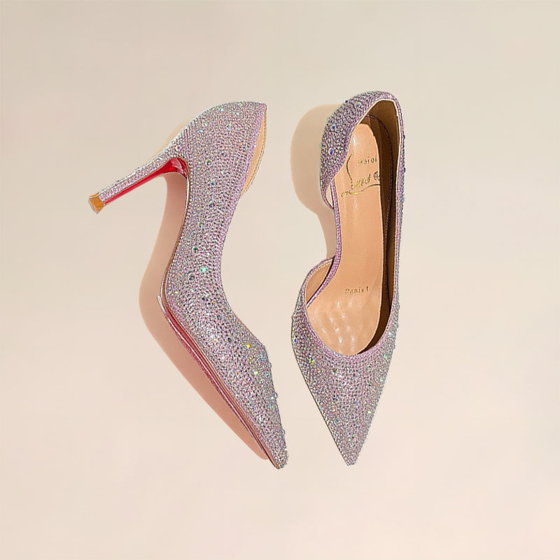 煌めくクリスタルが散りばめられたこのヒールは、まるで星空のように足元で輝き、華やかさとエレガンスを引き立てます。
